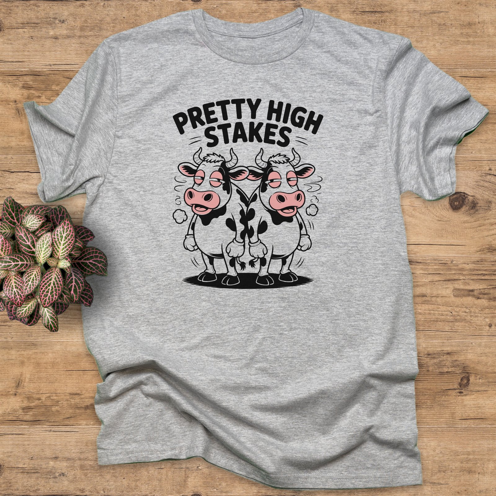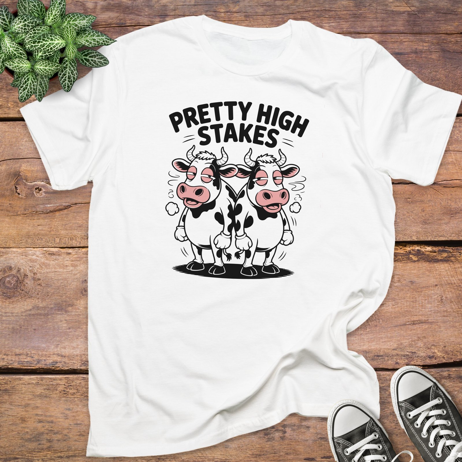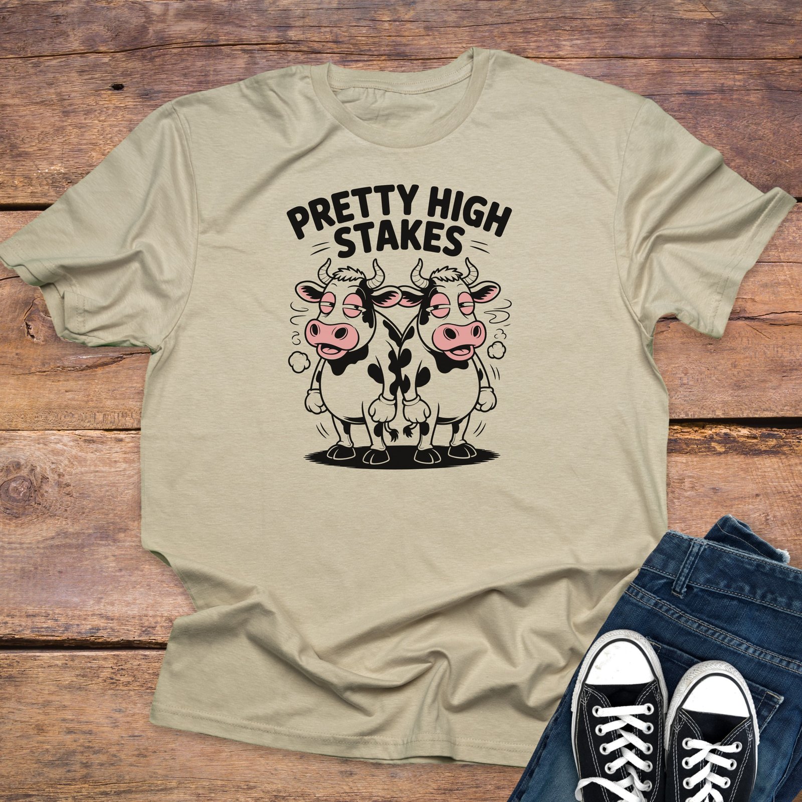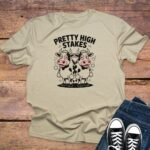 Show off your chill and humorous side with this “Pretty High Stakes” T-Shirt. Features a unique design with two relaxed cartoon cows that are perfect for casual wear.