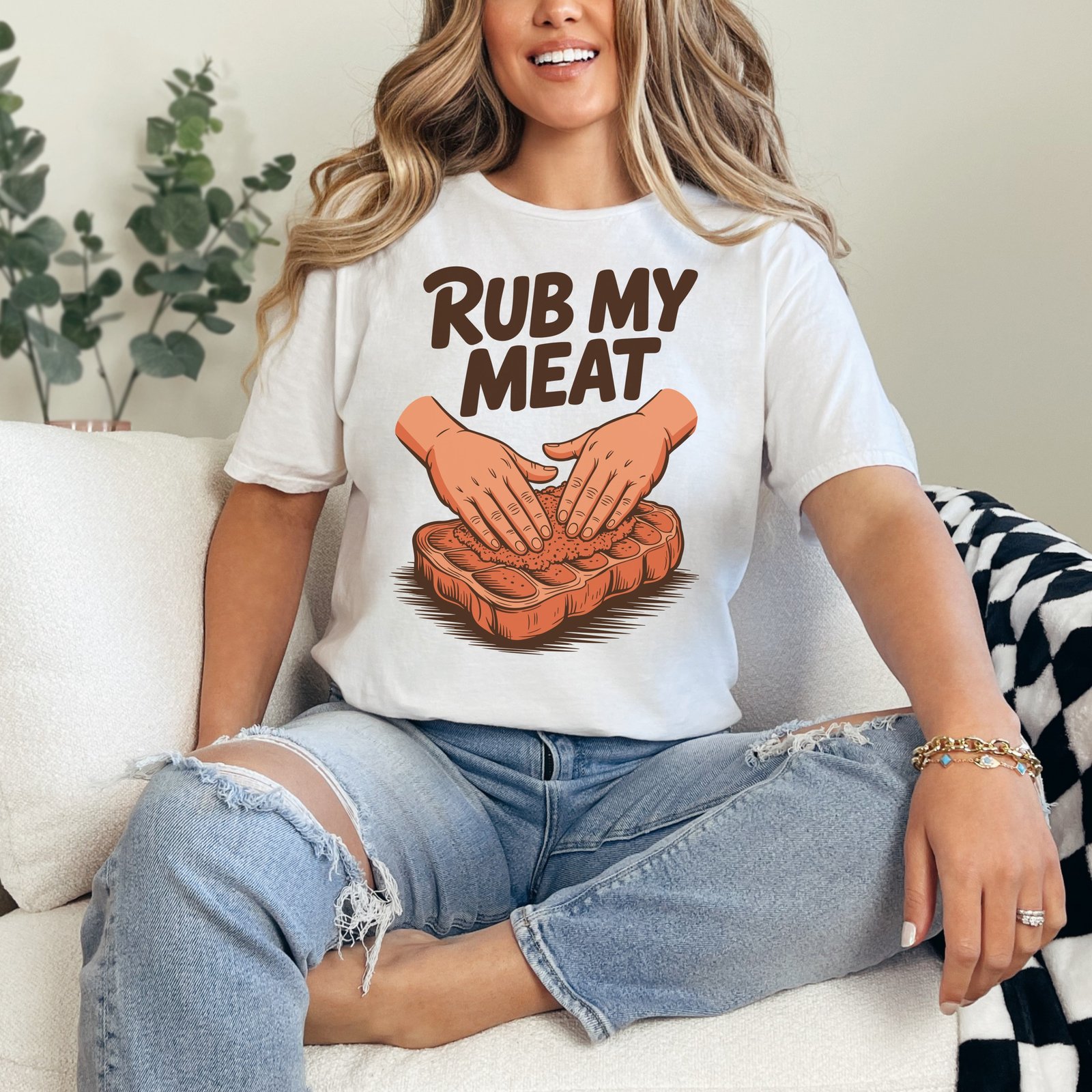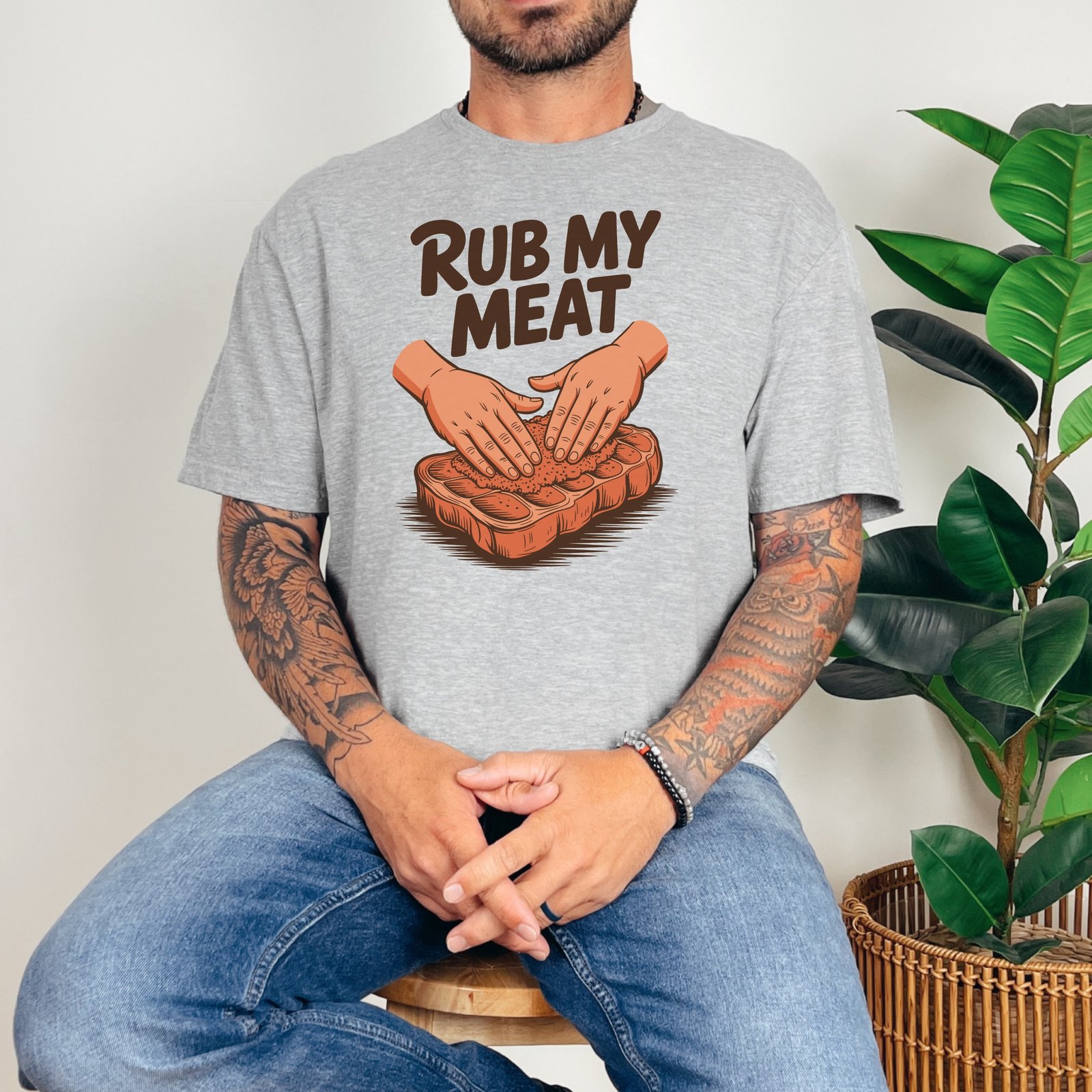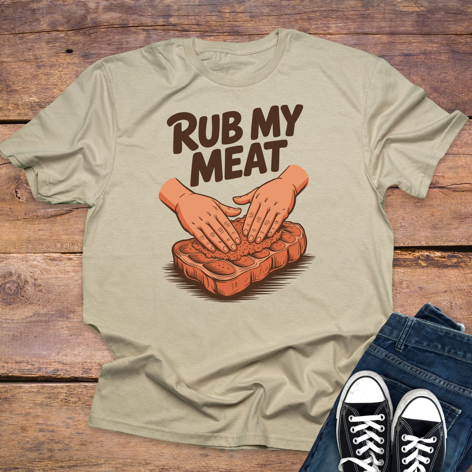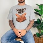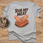 Get ready to turn heads with this suggestive “Rub My Meat” T-Shirt! This design featuring hands on a piece of meat is perfect for those who appreciate bold humor and sexy statements. Grab yours today!